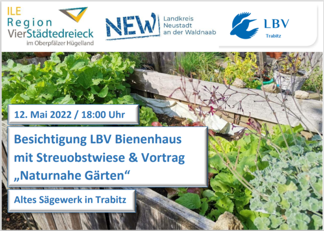 Veranstaltung der ILE Region VierStädtedreieck zum Thema Biodiversität am 12.05.2022. Die ILE Region VierStädtedreieck möchte sich in diesem Jahr vermehrt mit Themen im Bereich Biodiversität beschäftigen und lädt alle Interessierten nach Trabitz ins „Alte Sägewerk“ ein.